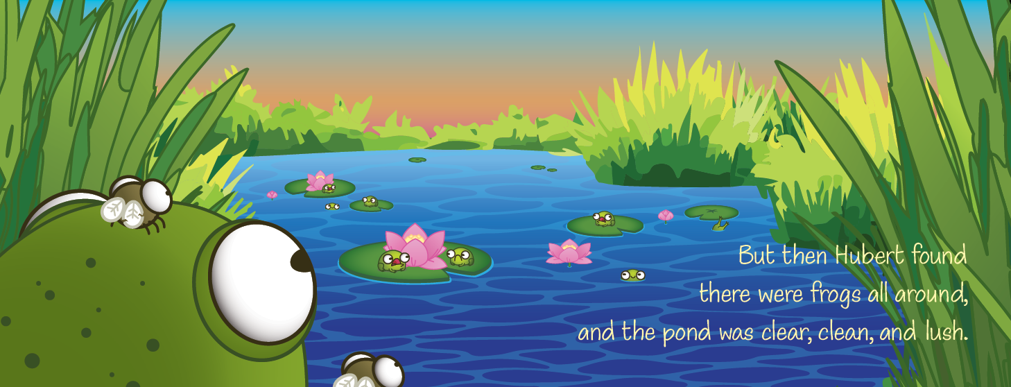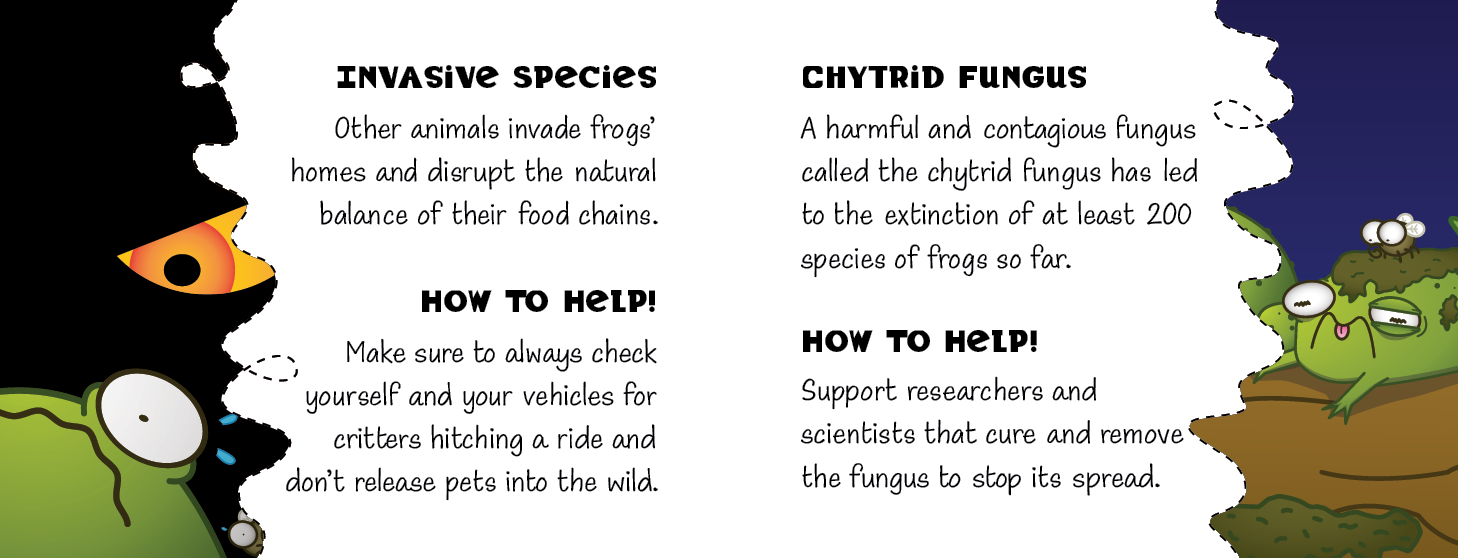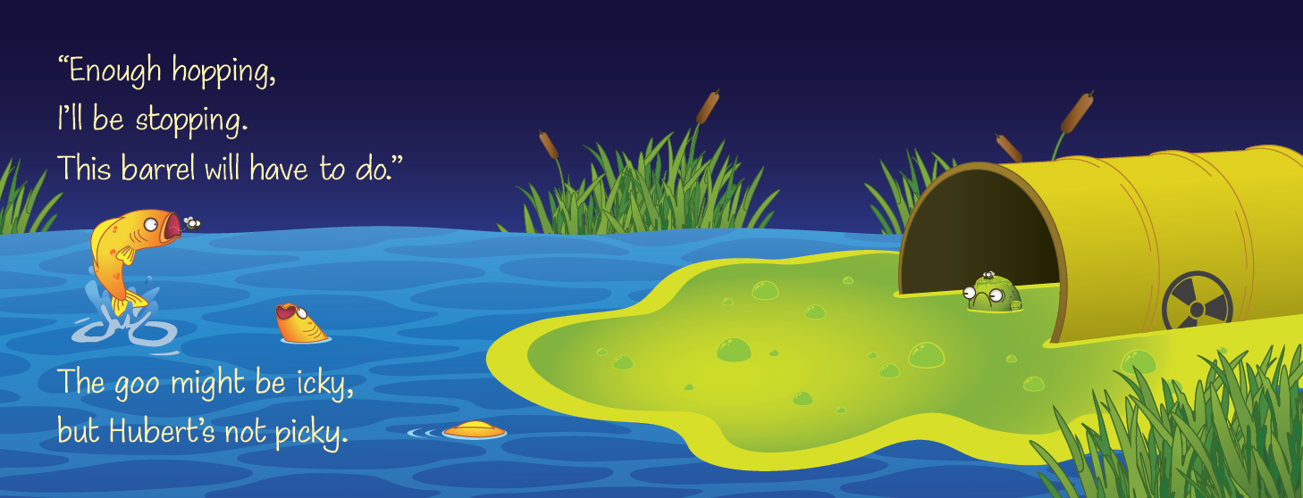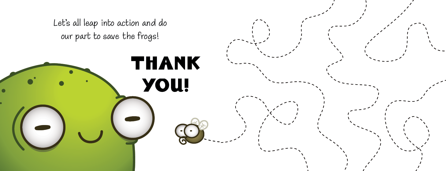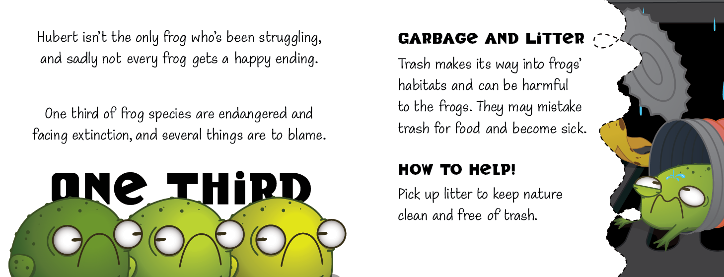What started as a doodle turned into a campaign to raise awareness about the issues facing frogs. Hubert’s struggles throughout the story highlight real world problems that are causing frog species to go extinct. Although Hubert finds a happy ending in this story, the book makes sure to emphasize that these are ongoing issues that need to be addressed and provides steps that readers can take to help.